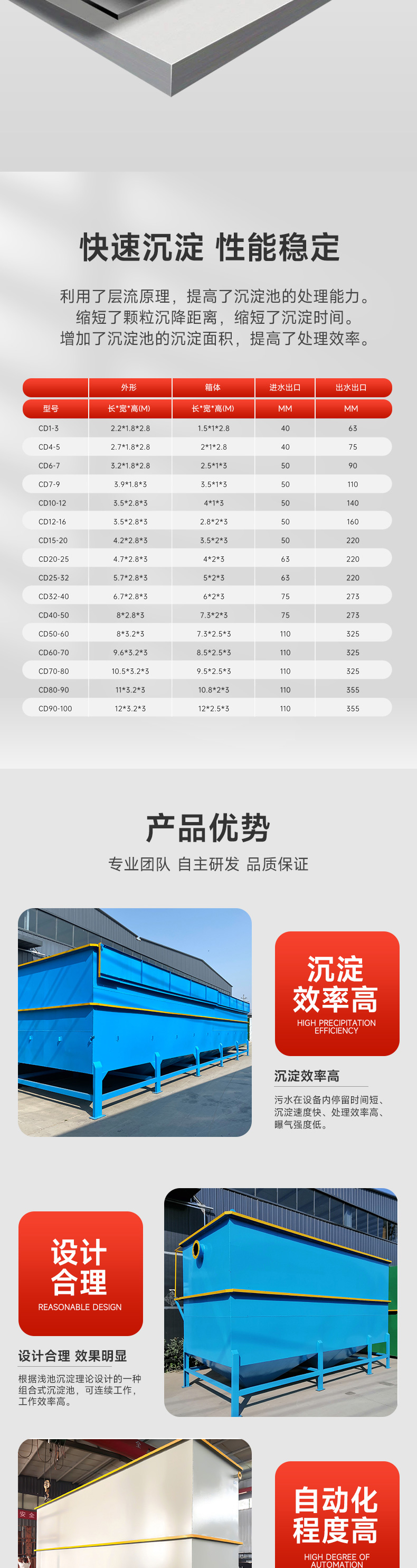 - 一、斜管沉淀池的特性是:(1) 應用了層流原理,水流在板間或管內活動,水力半徑很小,所以雷諾數較低,普通狀況下,雷諾數Re在200左右,水流呈現層流狀態,對沉淀極為有利,斜管內水流的弗勞德數約在1*10^-3~1*10^-4之間,水流呈穩定狀態。
